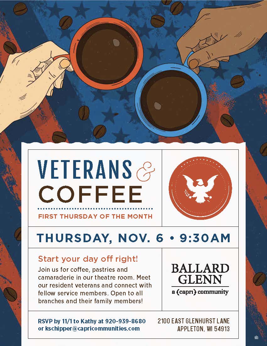 Join us for coffee and pastries in our theatre room. Meet our resident veterans and connect with fellow service members. Open to all branches and their family members!