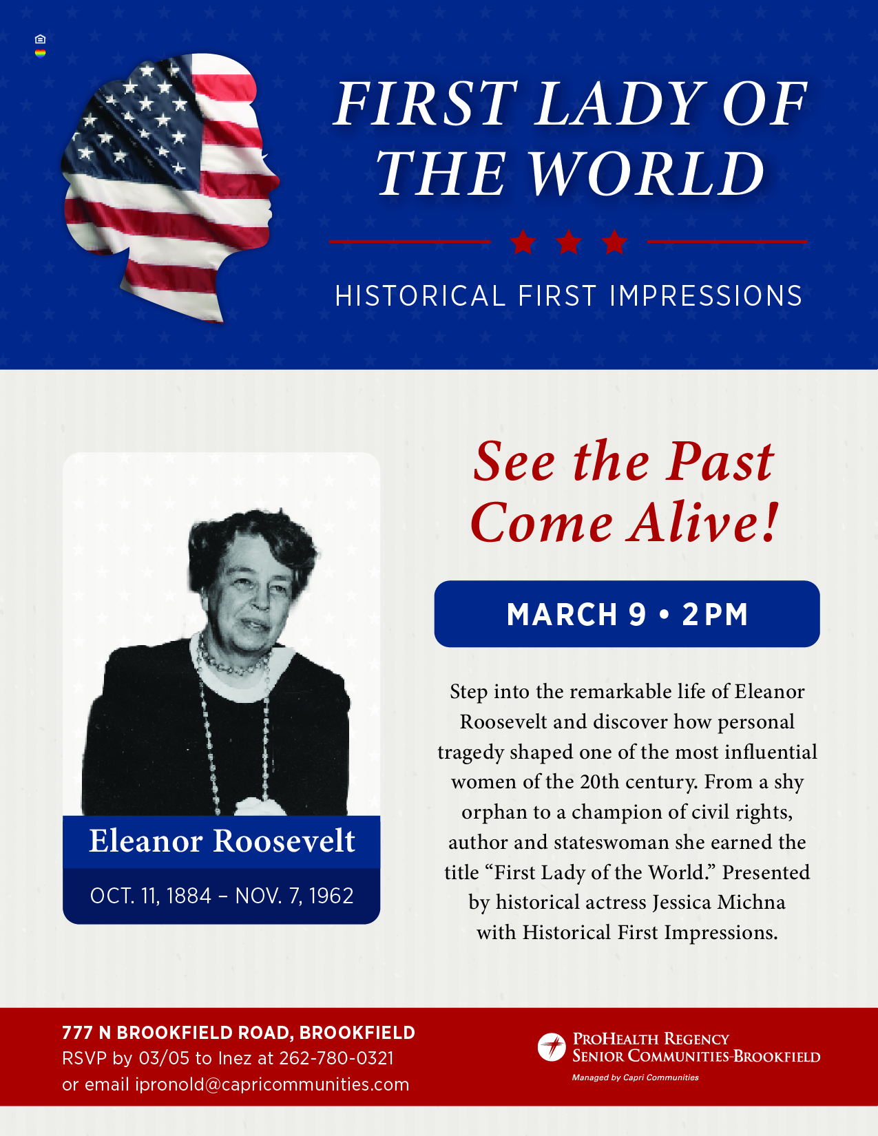 Step into the remarkable life of Eleanor Roosevelt and discover how personal tragedy shaped one of the most influential women of the 20th century. From a shy orphan to a champion of civil rights, author and stateswoman she earned the title “First Lady of the World.” Presented by historical actress Jessica Michna with Historical First Impressions.