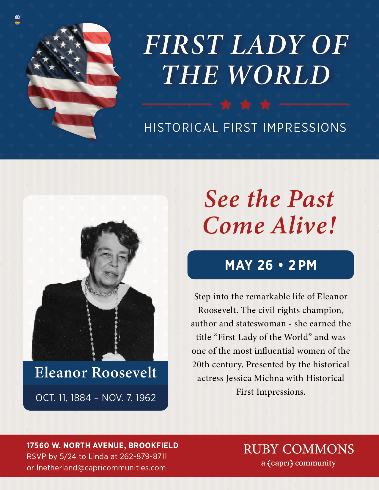 Step into the remarkable life of Eleanor Roosevelt. From a shy orphan to a champion of civil rights, author and stateswoman she earned the title “First Lady of the World.” Presented by the historical actress Jessica Michna with Historical First Impressions.