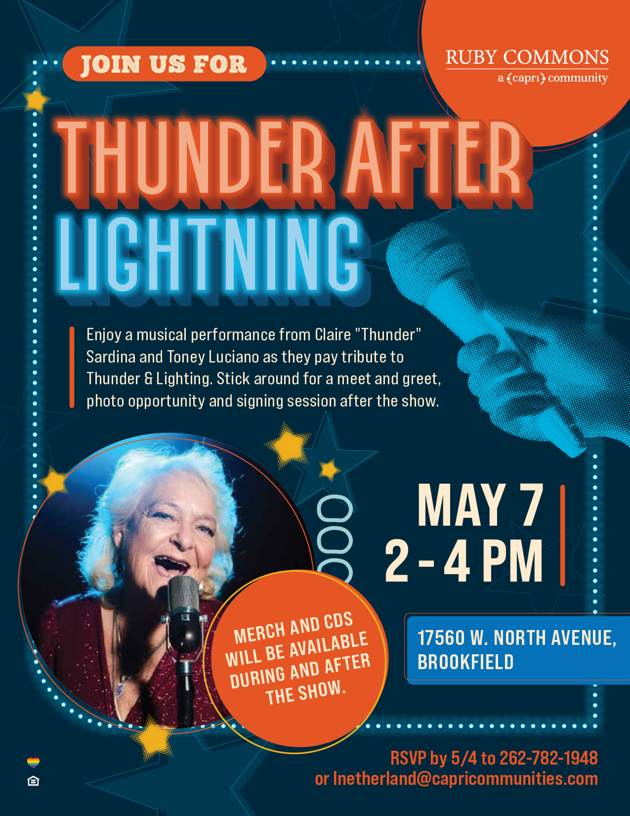 Enjoy a musical performance from Claire “Thunder” Sardina and Toney Luciano as they pay tribute to Thunder & Lighting. Stick around for a meet and greet, photo opportunity and signing session after the show.