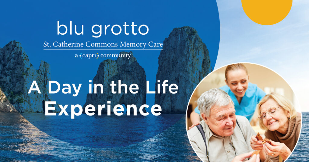 Join us with your loved one to experience our signature Blu Grotto Memory Care program. Explore and learn more by participating in activities and Dementia Live®, then enjoy lunch with our residents and take a tour of our community.