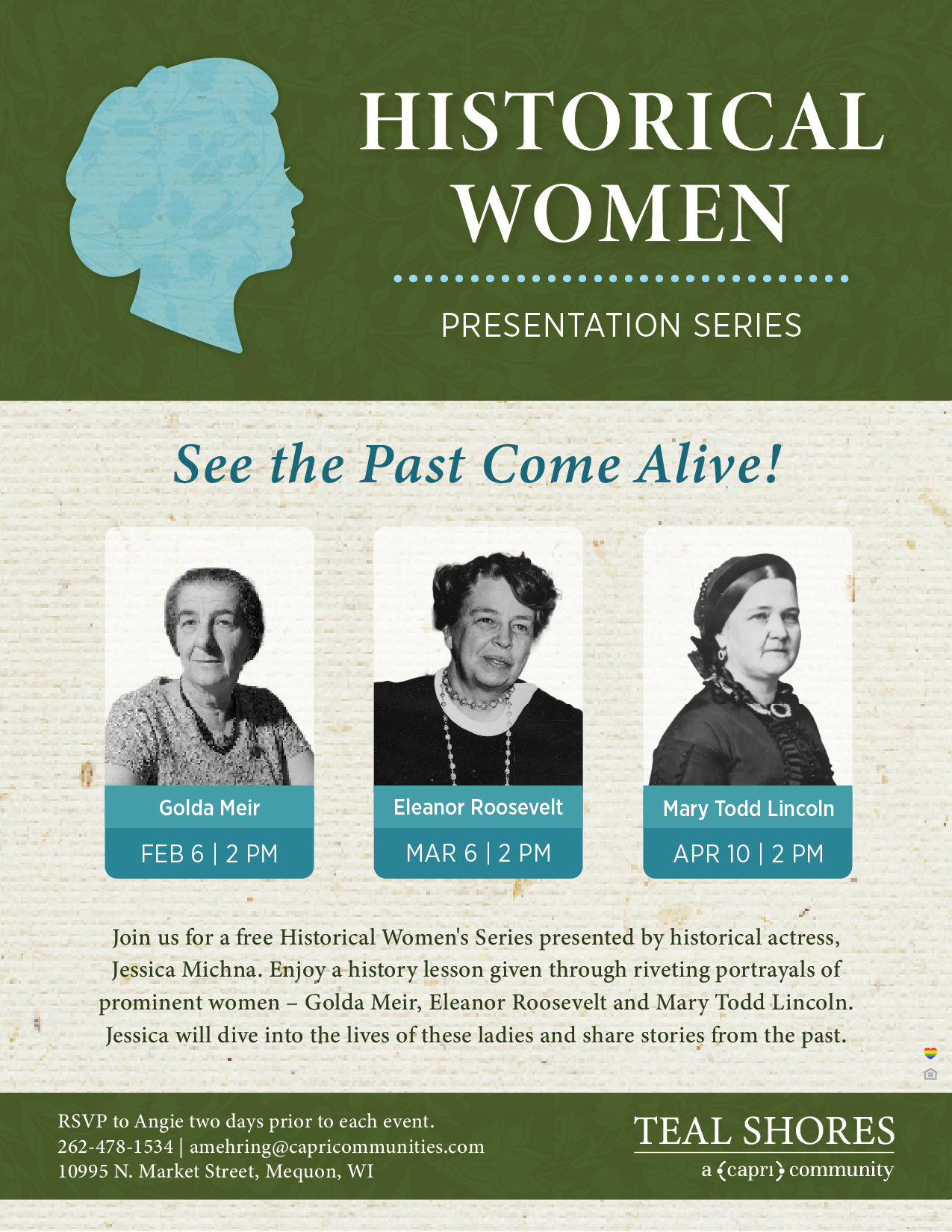 Event flyer titled Historical Women featuring black and white photos of Golda Meir, Eleanor Roosevelt, and Mary Todd Lincoln, with event dates and times. Presented by Jessica Michna on a green floral background.