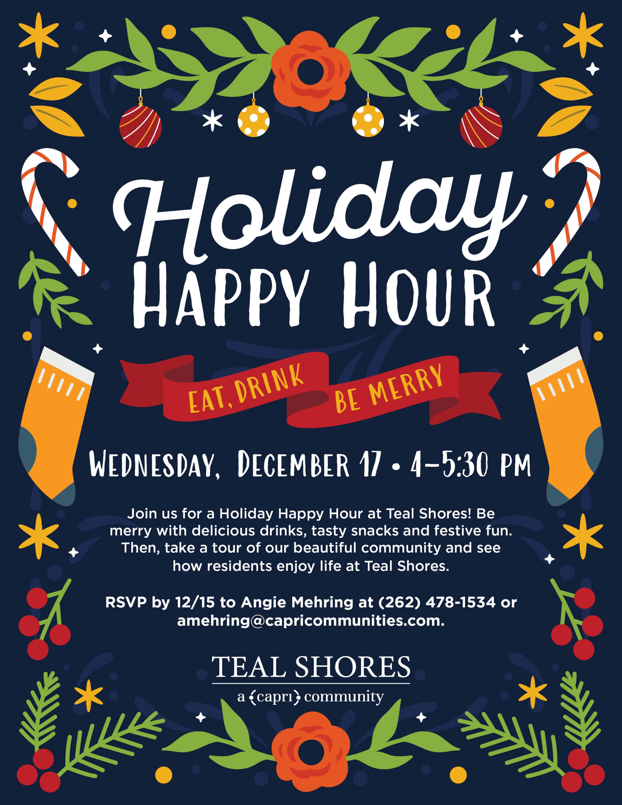 Join us for a Holiday Happy Hour at Teal Shores! Be merry with delicious drinks, tasty snacks and festive fun. Then, take a tour of our beautiful community and see how residents enjoy life at Teal Shores!